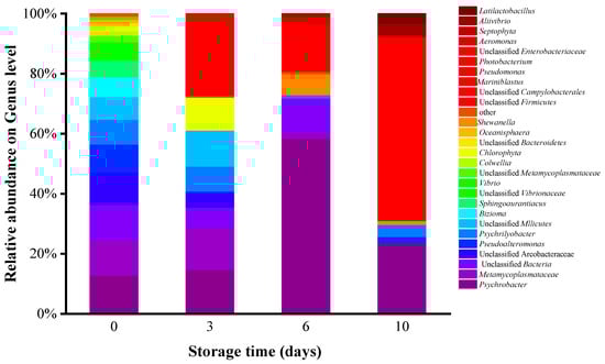 Bacteriome composition in chill-stored shucked oyster meat. (The microbiota composition was calculated at the genus level. Day 0, Day 3, Day 6, and Day 10 represent the storage time of shucked oyster meat.)