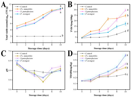 The growth of microorganisms in oyster meat inoculated with different microorganisms during storage is shown in Figure 2A. The TVC of the control remained below 2 Log10 CFU/g throughout the storage period. This result indicates that the control remained relatively fresh and that background microorganisms did not interfere with the experiment. The initial TVCs of the Ps. immobilis, S. putrefaciens, and P. swingsii groups were 5.21, 4.30, and 4.60 Log10 CFU/g, respectively. The initial oyster colony number range was met, and there were no significant changes between treatment groups (p > 0.05), making it eligible for a study of spoiling capacity. The exponential increase in the bacterial population from day 0 of storage to day 8 indicates that the intervening microorganisms adapted successfully to the oyster meat environment. All three bacteria exhibited rapid growth during storage, exceeding 8 Log10 CFU/g by day 10. After 8 days of storage, all the inoculated bacteria entered the stationary phase.