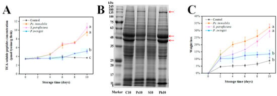 Microbial roles and functions in proteolytical activity. ((A): Changes in the TCA-soluble peptides concentration of the control and bacteria-inoculated samples. (B): The SDS-PAGE of myofibrillar proteins extracted from the control and bacteria-inoculated samples (the red arrows indicate protein bands with altered concentration. C10, Ps10, S10, and Ph10 represent the control samples, Ps. Immobilis-inoculated samples, S. putrefaciens-inoculated samples, and P. swingsii-inoculated samples on day 10, respectively). (C): Changes in the weight loss of the control and bacterial inoculated samples). Different lowercase letters represent significant difference among various groups (p < 0.05).