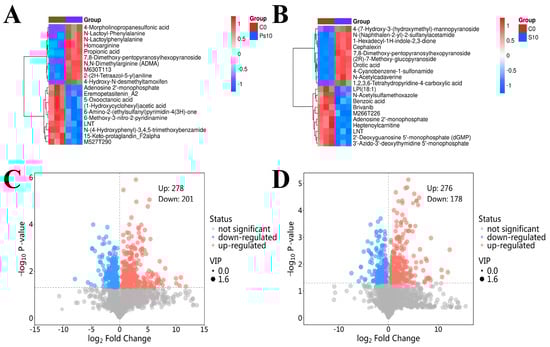 The volcano plot provides a clearer perspective on the general distribution of metabolite disparities between groups. In this study, Student’s t-test with a p-value less than 0.05 and a variable importance in the projection (VIP) greater than 1 were used as criteria to screen for differential metabolites. The results of group C0 versus group Ps10 are shown in Figure 4C. The results of group C0 versus group S10 are displayed in Figure 4D. The top 10 significantly up-regulated and significantly down-regulated differential substances are labeled in the figure. As shown in Figure 4C,D, the significantly elevated differential metabolites in the volcano plot have a clear correspondence with the significantly elevated differential metabolites in the heat map, again indicating that the above metabolites may be able to be used as markers of spoilage.