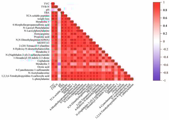 To further clarify the changes in metabolite content with the freshness of oysters, a correlation analysis was conducted between the significantly increased differential metabolite content in the heatmap and the spoilage indicators of TVC, TVB-N, pH, TBARS, TCA-soluble peptide, and weight loss. As shown in Figure 5, the significantly increased differential metabolite contents in the Ps and S groups of oysters compared to the C10 group are all significantly positively correlated with TVC, TVB-N values, TBARS values, and TCA-soluble peptides contents. Since pH tends to decrease and then increase during oyster storage, there is no strong correlation between pH and other indicators of spoilage as well as metabolites. It is not difficult to find that 1,2,3,6-Tetrahydropyridine-4-carboxylic acid and Propionic acid are the metabolites most closely related to spoilage indicators. Since the correlation analysis includes data from both the Ps group and the S group, it indicates that 1,2,3,6-Tetrahydropyridine-4-carboxylic acid and Propionic acid are strongly associated with the metabolic activities of Ps. immobilis and S. putrefaciens, which lead to oyster spoilage. There have been reports with similar conclusions to those of this study. Zhang et al. [32] determined that Butanoic acid accounted for 4.69% and Propanoic acid accounted for 2.06% of the top 10 compounds that differed in volatile profile characteristics during oyster storage using the HSSPME method, and he noted that organic acids consisted of the major volatile profile characteristics of oysters during storage. Therefore, 1,2,3,6-Tetrahydropyridine-4-carboxylic acid and Propionic acid have the potential to serve as metabolic markers for oyster spoilage.
