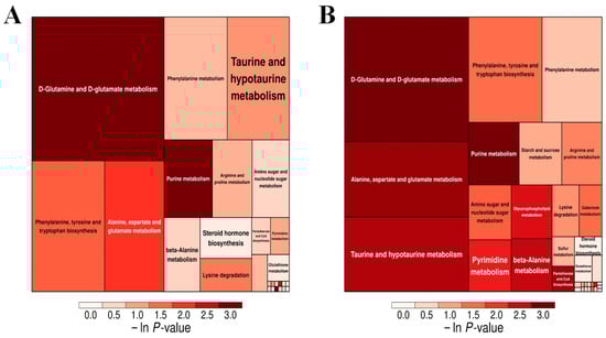 The KEGG pathway analysis of samples inoculated with Ps. immobilis and S. putrefaciens is shown in Figure 6. Each square in the figure represents a metabolic pathway in the process of oyster meat spoilage. The size of the square indicates the impact factor of the metabolic pathway, and the color of the square indicates the p-value of the enrichment analysis (using the negative natural logarithm -ln(p)), with darker colors indicating more significant enrichment. Therefore, the metabolic pathways represented by squares that are larger and darker in color will be the focus of our research. As shown in Figure 6, the squares representing the metabolic pathways for D-glutamine and D-glutamate metabolism are the darkest and largest in both the Ps and S groups, indicating that these pathways are most strongly affected and may serve as potential target pathways for food spoilage [33,34]. In Figure 6, the significantly enriched metabolic pathways include purine metabolism, alanine, aspartate, and glutamate metabolism, and phenylalanine, tyrosine, and tryptophan biosynthesis (-ln p-value > 1.5). In the D-glutamine and D-glutamate metabolism pathway, L-glutamic acid and L-glutamine are consumed to produce proline, and then arginine and proline are consumed during metabolism. Syropoulou et al. [35] found that seafood spoilage due to the metabolic activity of cold-tolerant bacteria affected arginine and proline metabolism. Notably, in the entire D-glutamine and D-glutamate metabolism pathways, only L-phenylalanine increased significantly during storage. Given that phenylalanine, tyrosine, and tryptophan biosynthesis are also significantly enriched pathways, L-phenylalanine may be used as a potential spoilage marker in oysters. In this study, inoculating oyster meat with a single strain can eliminate bacterial interactions, thereby facilitating the elucidation of the exact role of the tested bacteria and the analysis of their metabolites. In order to specifically inhibit the process of oyster spoilage and prolong the shelf life in the next step, a preliminary study was carried out. Nonetheless, the true activities of spoilage microorganisms and their potential interactions are also worth exploring through the application of metabolomics in naturally spoiled oyster meat.
