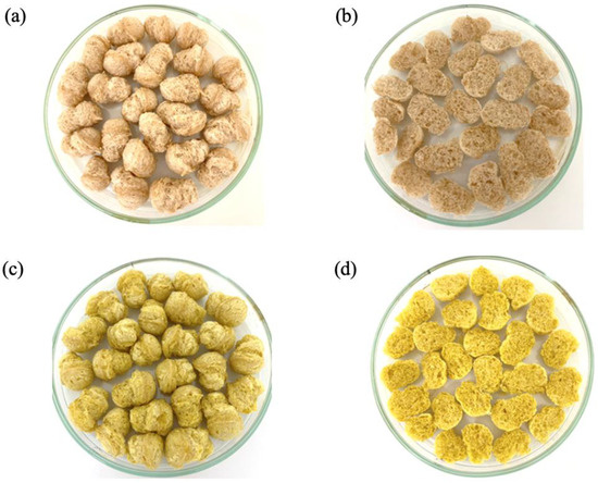 Appearance of functional food extruded snacks: external appearance of control formula (a), internal appearance of control formula (b), external appearance of curcumin microcapsule (c), and internal appearance of curcumin microcapsule (d).
