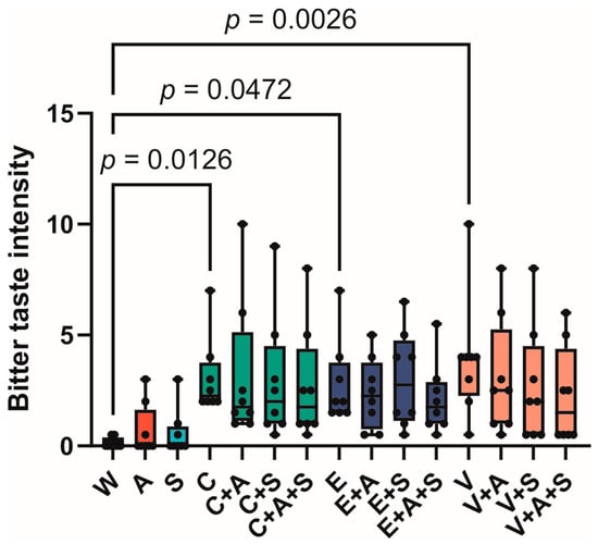 Intensity of bitter taste of the tested samples. Boxes represent confidence intervals, whiskers—minimal and maximal values (A—AMP, C—caffeine, E—epigallocatechin gallate, S—saliva substitute, V—vanillin, W—water).