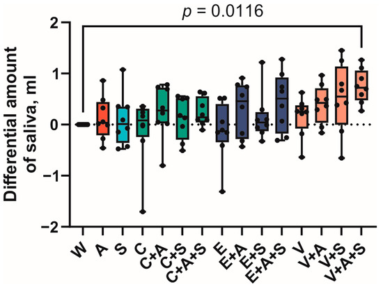 Differential amount of the secreted saliva. Boxes represent 95% confidence intervals, whiskers—minimal and maximal values (A—AMP, C—caffeine, E—epigallocatechin gallate, S—saliva substitute, V—vanillin, W—water).