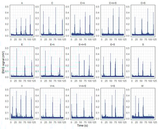 Characteristic EMG curves for each sample obtained from a single expert after filtration, normalization and signal integration. (A—AMP, C—caffeine, E—epigallocatechin gallate, S—saliva substitute, V—vanillin, W—water).