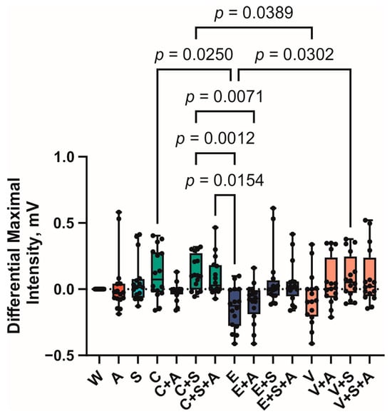 Differential maximal intensity of sEMG curve. Boxes represent 95% confidence intervals, whiskers—minimal and maximal values (A—AMP, C—caffeine, E—epigallocatechin gallate, S—saliva substitute, V—vanillin, W—water).