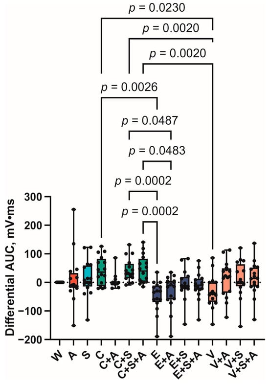 Differential area under the curve of EMG swallowing curve. Boxes represent 95% confidence intervals, whiskers—minimal and maximal values. (A—AMP, C—caffeine, E—epigallocatechin gallate, S—saliva substitute, V—vanillin, W—water).