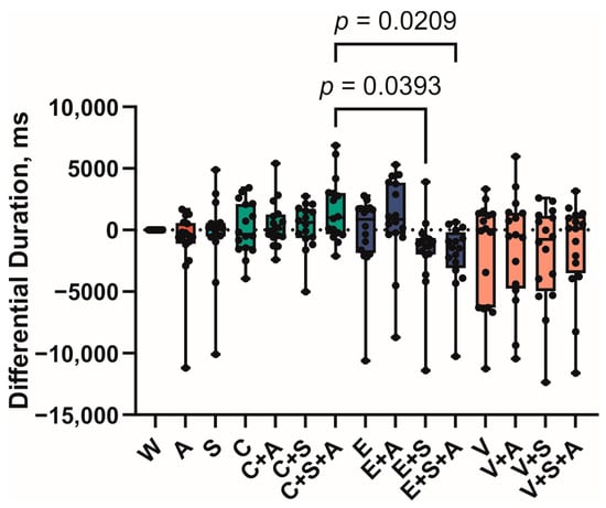 The variation in the sip duration value was less pronounced (Figure 7). Two significant differences were observed between the groups C + S + A and E + S + A (p = 0.0209), and C + S + A and E + S (p = 0.0393). These findings suggest that the effect of saliva substitutes on swallowing and salivary secretion processes may differ in the presence of different bitter-tasting substances.