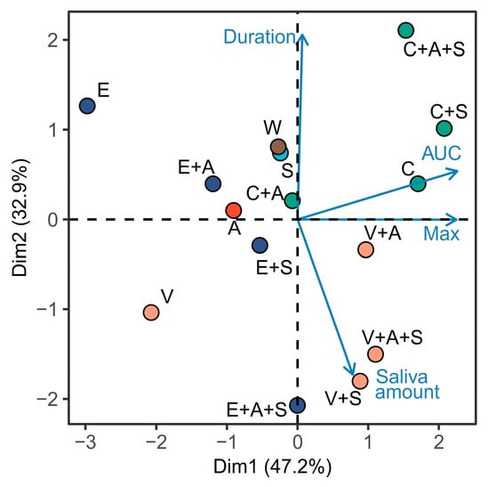 The application of the principal component analysis method enabled the identification of the primary regularities of changes in the processes of salivation and swallowing under the influence of the studied stimuli (Figure 8).