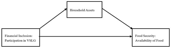 Poverty and economic hardships are common barriers to sustainable development and healthy living worldwide []. In low-income communities, formal and informal financial inclusion can address life-threatening shocks that hinder healthy living, depending on demographic and socioeconomic characteristics and accessibility to financial services [,,]. This study proposes FI as a mechanism to tackle the issue of food availability in households, encompassing factors such as affordability and access. Specifically, it examines the association between a community-based financial inclusion (IFI) opportunity (through participation in village savings and loan groups (VSLGs)) and household food security (HFS) among low-income women in Mozambique and accounts for the intermediary role of household asset ownership.