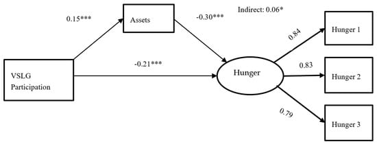 Preliminary analysis of the bivariate relationships revealed that HHS was significantly and inversely correlated with VSLGs (r = −0.236, p = 0.001) and household assets (r = −0.332, p < 0.001). This suggests that VSLG participants had lower HHS scores, indicating reduced levels of hunger, and higher levels of household assets, which were associated with a lower probability of experiencing food insecurity among VSLG participants compared to non-VSLG participants. The SEM model had good model fit indices, with a non-significant chi-squared value (chi2 = 0.67) and Pclose (0.830). The model fit was acceptable, with both the comparative fit index (CFI) and the Tucker–Lewis index (TLI) showing perfect scores of 1.000 and 1.013, respectively, meaning the model matches the data very well. Additionally, the standardized root mean square residual (SRMSR) was 0.082, and the root mean squared error of approximation (RMSEA) was 0.000, both very low, further confirming that the model accurately represents the data. Per the SEM model in Figure 2, participation in VSLGs was a significant negative predictor of household hunger (β = −0.21, p < 0.01), meaning participation in VSLGs is associated with a lower household hunger score. The results also showed a significant positive association of participation in VSLGs with increased ownership of household assets (β = 0.15, p < 0.025), and, in turn, a significant inverse correlation of the ownership of assets with household hunger score (β = −0.30, p < 0.01). The Sobel test confirmed that, besides the direct association, participation in VSLGs had a significant indirect role in lowering household hunger through the ownership of household assets (Sobel indirect effect [β = −0.06, p = 0.05]). The results from the factor loadings of the household hunger scale (HHS) with three items show robust values (0.84, 0.83, and 0.79), indicating strong associations between the items and the latent factor of hunger. These values suggest that the items are highly correlated with the underlying construct of hunger, with loadings well above the commonly accepted threshold of 0.5–0.6, indicating a valid and reliable scale.