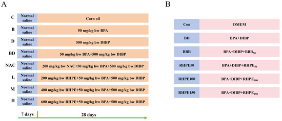 Four-week-old specific pathogen-free (SPF) male KM mice were from Sipeifu (Co., Ltd., Beijing, China). The experimental mice were allowed to drink in a 12/12 h light/dark cycle animal home [34]. After a week rest period, these mice were randomly divided into Eight groups (n= 8 mice/group): the control group (C); BPA group (B); DIBP group (D); BPA + DIBP group (BD); BPA + DIBP + NAC group (NAC, as positive control); BPA + DIBP + RHPE200 group (L); BPA + DIBP + RHPE400 group (M); BPA + DIBP + RHPE600 group (H). The concentration of BPA is 50 mg/kg, DIBP 500 mg/kg, RHPE 200, 400 and 600 mg/kg, respectively. The detailed procedures are presented in Figure 1A. To summarize, mice were administered saline from day 1 to day 7, followed by corn oil, BPA, and DIBP on days 8 to 28, respectively. The NAC group and RHPE-pretreated group (L, M, H) were administered NAC and RHPE first, followed by BPA and DIBP (Table 1). The mice were sacrificed after anesthesia (CO2 inhalationc, 1–2 min) on day 28, and the samples were collected for the determination. After surgical resection, the liver and spleen were weighed separately, and the organ index was determined using the following formula:
