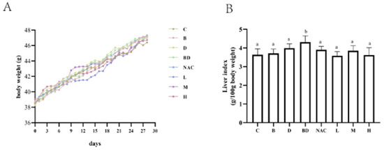 Effect of RHPE on organ index in mice. (A) Body weight change of the mice. (B) Liver index. Different letters indicated significant differences among groups (p < 0.05).