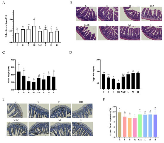 RHPE improved the pathological damage caused by BPA + DIBP combined exposure in mice. (A) Serum D-Lac levels in mice. (B) Representative images of H&E staining of ileum sections. (C,D) Villus height and crypt depth. (E,F) E-cad immunohistochemical staining analysis. Different letters indicated significant differences among groups (p < 0.05).