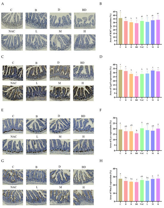RHPE promotes the proliferation and differentiation of mouse intestinal stem cells. Immunohisto-chemical staining and relative positive area of (A,B) Ki67. (C,D) Lgr5. (E,F) Lyz. (G,H) Muc2. (I,J) AB–PAS staining of goblet cells. Different letters indicated significant differences among groups (p < 0.05).