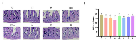 Moreover, ISCs can differentiate into functional enterocytes, such as goblet cells, Paneth cells, and enteroendocrine cells. We evaluated the differentiation of ISCs by measuring changes of Lyz (a marker of Paneth cells) and Muc2 (a marker of goblet cells). The results indicated that the combined action of BPA + DIBP could significantly affect the generation of Paneth cells and goblet cells. The RHPE intervention resulted in an increase in the region of positive Muc2 expression and no change in Lyz expression (Figure 4E–H). The mucus barrier plays an important role in maintaining intestinal homeostasis [43]. We further investigated the effect of RHPE on the number of cupped cells by AB–PAS staining. As depicted in Figure 4I,J, the BPA + DIBP group had considerably fewer goblet cells than the control group. Nevertheless, supplements with RHPE substantially improved the depletion of goblet cells induced by BPA and DIBP. To summarize, we employed the Caco-2/HT29-MTX co-culture model to validate the in vivo results.