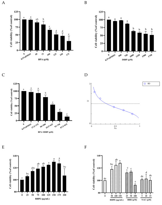 Caco-2/HT29-MTX Co-culture cytotoxicity of BPA, DIBP and RHPE. (A) BPA cell viability (24 h). (B) DIBP cell viability (24 h). (C) BPA + DIBP cell viability (24 h). (D) BPA and DIBP CI index analysis. (E) Effect of RHPE on cell viability. (F) BBR and NAC cell viability. Different letters indicated significant differences among groups (p < 0.05).