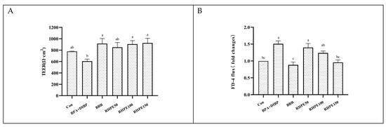 D-Lac enters the blood when the intestine barrier is damaged, causing a rise in D-Lac levels in the blood. As a result, D-Lac is frequently utilized as an indicator of intestinal injury [41]. Compared with the control group (121 ± 7 μmol/L), the level of D-Lac in the BPA + DIBP group (136 ± 14 μmol/L) was significantly higher (p < 0.05), and there were no notable changes in the B and D groups. This suggests that BPA and DIBP exposure alone did not result in significant harm to mice. However, when the two were combined, the intestinal permeability of mice was significantly increased. The serum D-Lac levels of mice exposed to combined BPA + DIBP were reduced under the RHPE intervention (Figure 3A).