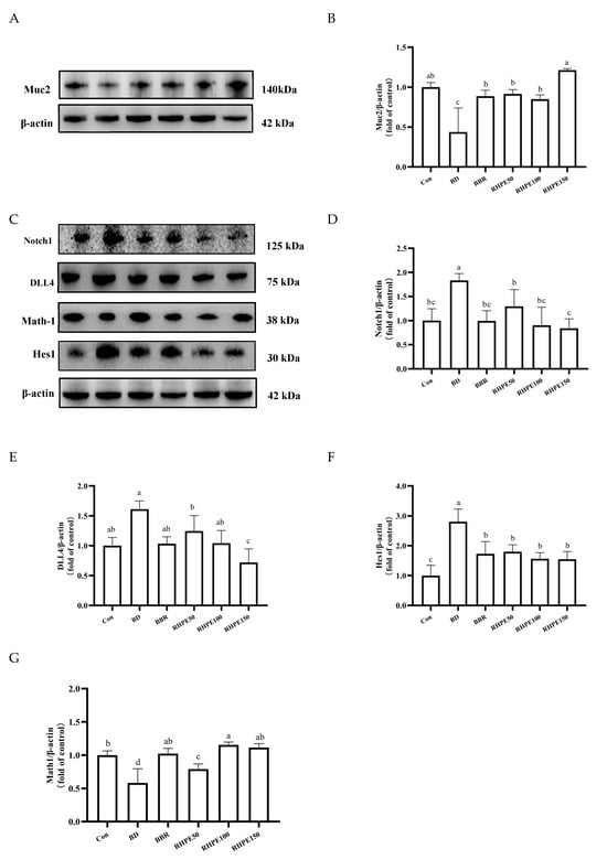 RHPE alleviates goblet cell damage through DLL4–Notch1–Hes1–Math1 pathway. (A,B) Relative protein expression of Muc2. (C) Notch pathway key protein expression was measured by Western blotting in Caco-2/HT29-MTX. (D–G) Notch1, DLL4, Hes1, Math1. Different letters indicated significant differences among groups (p < 0.05).