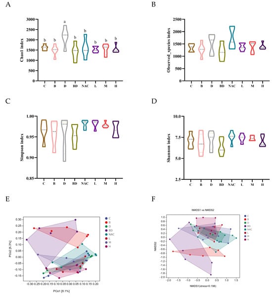 Effects of RHPE on gut microbiota in BPA- and DIBP-induced mice. (A) Chao1 index. (B) Observed-species index. (C) Simpson index. (D) Shannon index. (E,F) Principal coordinate analysis (PcoA) and NMDS of β diversity. Different letters indicated significant differences among groups (p < 0.05)