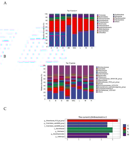 In order to determine the bacteria alteration by the RHPE administration, biomarkers between several groups were identified using linear discriminant analysis (LDA). Data indicated that the control group was significantly enriched in both the g_Clostridiales_vadinBB60_group and the f_Clostridiales_vadinBB60_group. The BPA group was enriched considerably in the g_Rikenellaceae_RC9_gut_group, while group L was significantly enriched in f_Marinifilaceae and g__Odoribacter, and group M was significantly enriched in g_Macellibacter oides and g__Hathewaya (Figure 9C).