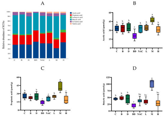 Effects of RHPE on the content of SCFAs in mice. (A) Relative content of SCFAs. (B) Acetic acid. (C) Propionic acid. (D) Butyric acid. Different letters indicated significant differences among groups (p < 0.05).