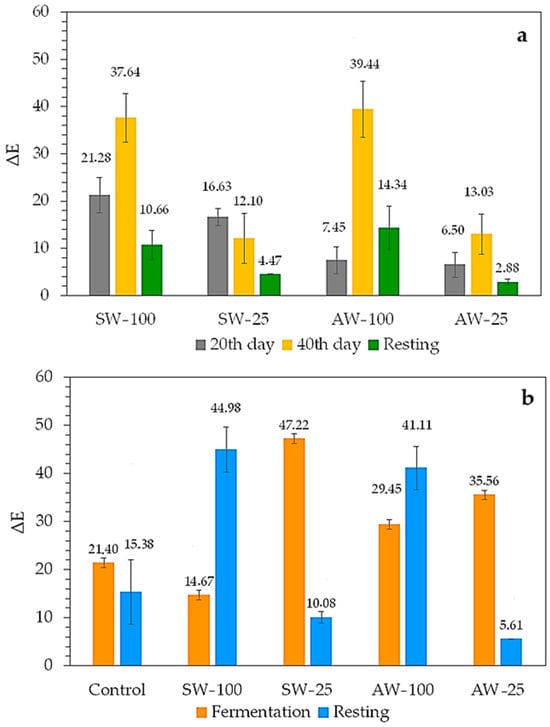 ΔE values of fermented black carrot juice samples. (a) Color changes in whey-containing samples compared to control on 20th and 40th days of fermentation and after resting. (b) Color changes in all fermented black carrot juices during fermentation and after resting. For the ΔE values in fermentation, which are represented by the blue column, the data from the 20th day of each sample were selected as L*0, a*0, and b*0. Similarly, for the ΔE values in rest, which are shown in the red column, the values from the 40th day of each sample were chosen as L*0, a*0, and b*0. (SW-25: 25% sweet whey, SW-100: 100% sweet whey, AW-25: 25% acid whey, AW-100: 100% acid whey).