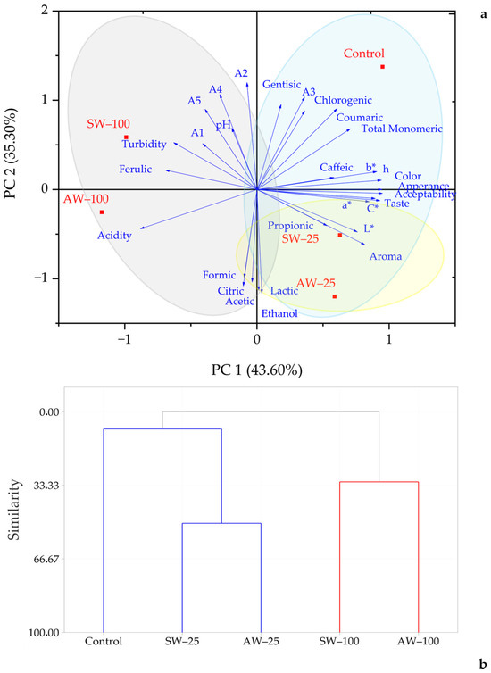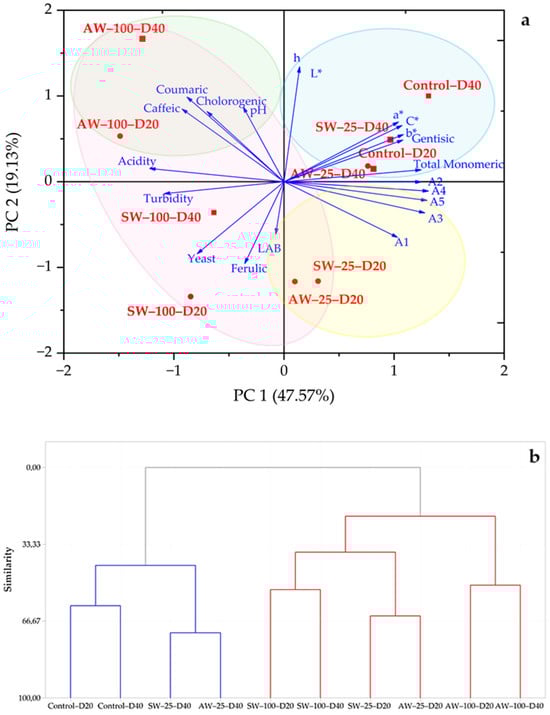 (a) The loading and score plot of PC1 and PC2 describing the variation among the physicochemical, microbiological, and phytochemical properties of fermented black carrot juice samples taken at different periods of fermentation; (b) dendrogram representation corresponding to the physicochemical, microbiological, and phytochemical properties of fermented black carrot juice samples taken at different periods of fermentation. LAB: lactic acid bacteria count; A1: cyanidin-3-xylosylglucosylgalactoside; A2: cyanidin-3-xylosylgalactoside; A3: cyanidin-3-xylosyl(sinapolyglucosyl)galactoside; A4: cyanidin-3-xylosyl(feruloylglucosyl)galactoside; A5: cyanidin-3-xylosyl(coumaroylglucosyl) galactoside; SW-25: 25% sweet whey; SW-100: 100% sweet whey; AW-25: 25% acid whey; AW-100: 100% acid whey.