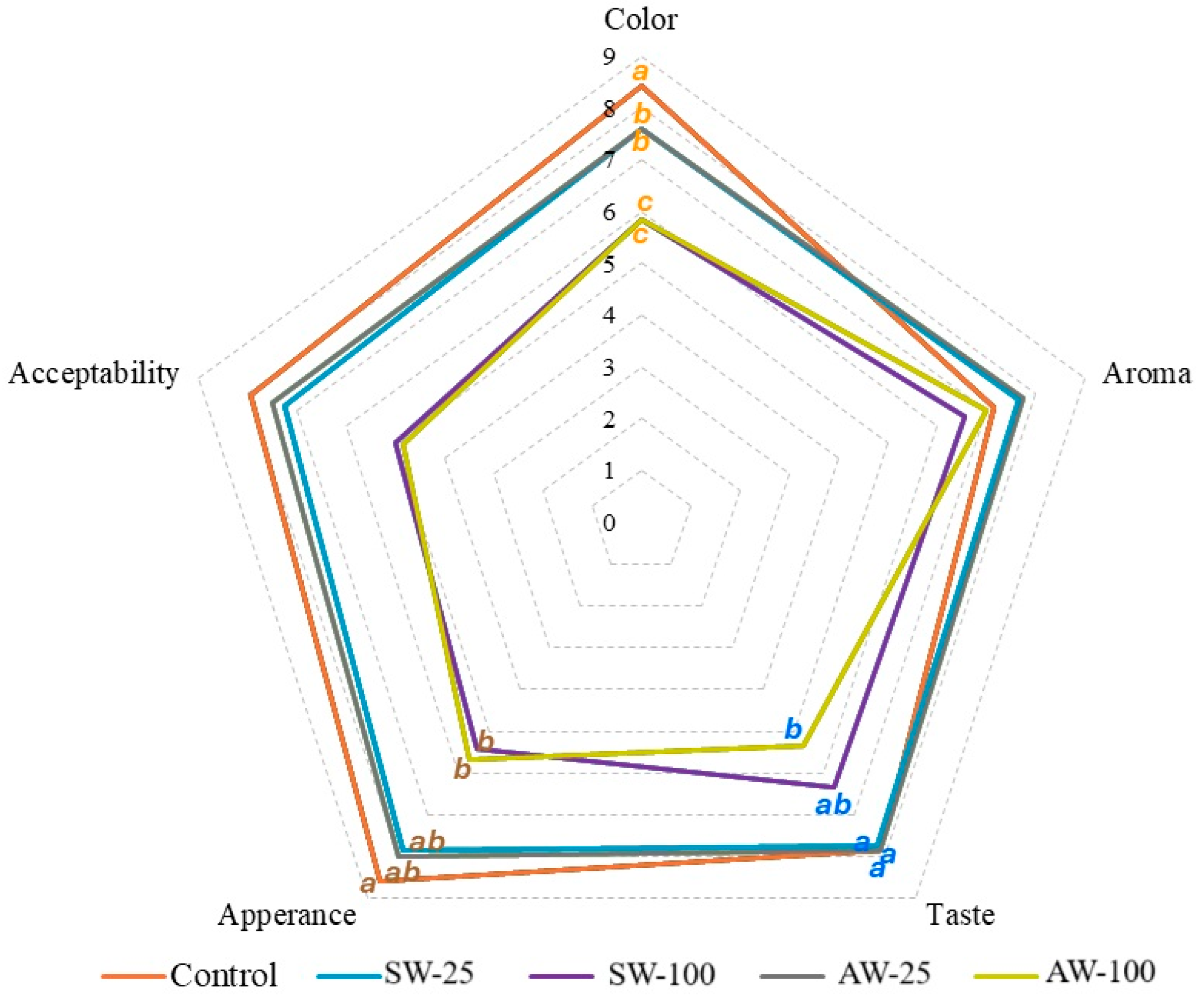 The radar plot of sensory evaluation of fermented black carrot juice samples (SW-25: 25% sweet whey; SW-100: 100% sweet whey; AW-25: 25% acid whey; AW-100: 100% acid whey). SW—sweet whey; AW—acid whey; different letters in the same color indicate the difference between means. Numbers between 0–9 show the degree of liking (9 = extremely liked; 1 = very disliked).