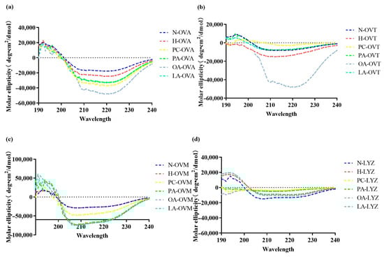 The circular dichroism spectra of OVA (a), OVT (b), OVM (c), and LYZ (d) treated with and without lipids (PC, PA, OA, and LA).