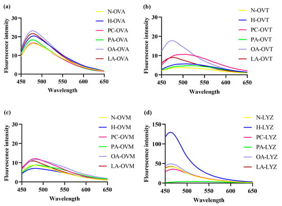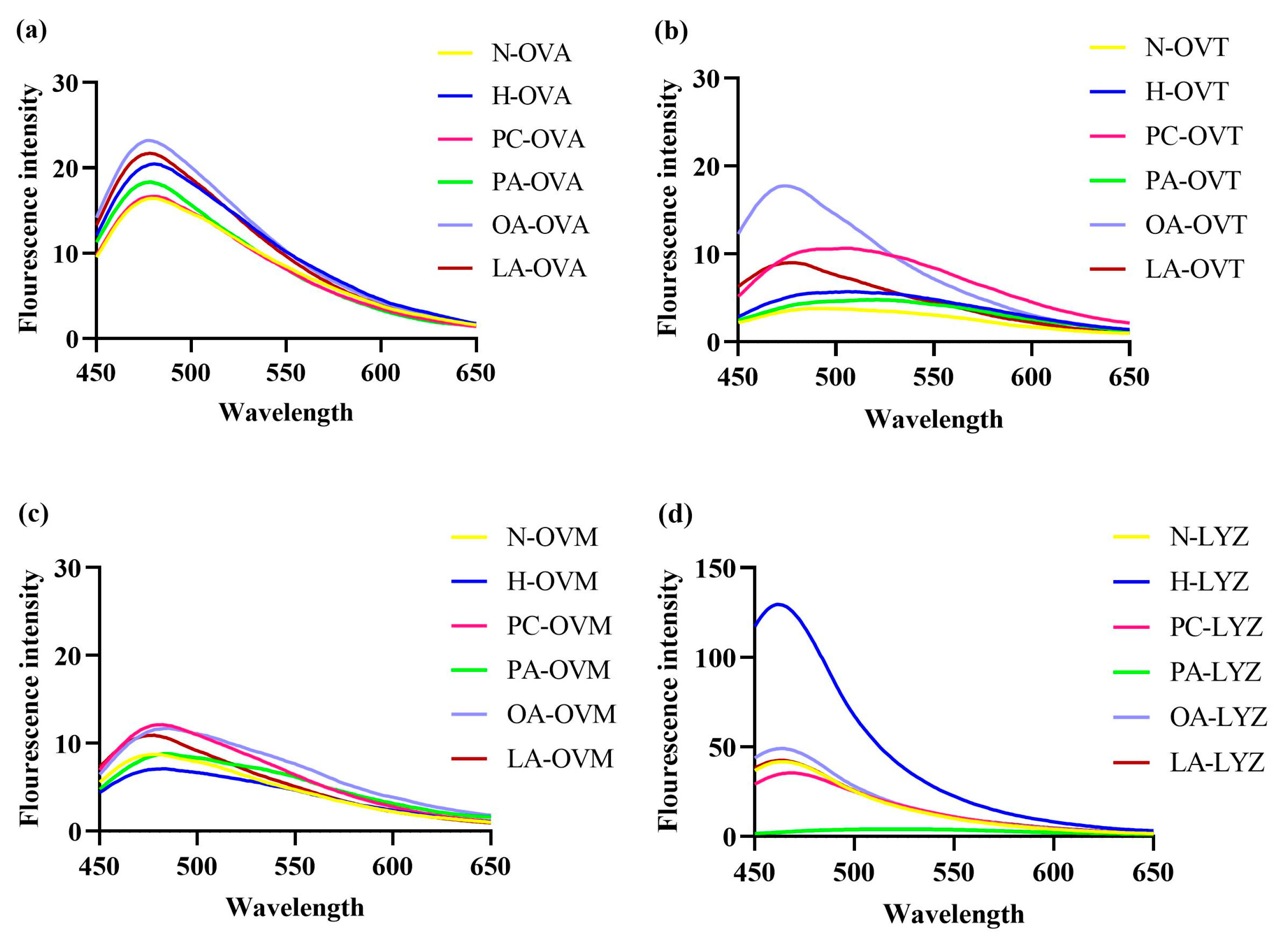 In Figure 4a, compared to heated OVA, the fluorescence intensity of the OA and LA groups increased, while the fluorescence intensity of the PA and PC groups decreased. This may be due to the addition of the four lipids, which altered the conformation of OVA, leading to structural expansion and the exposure of internal hydrophobic amino acids [31]. Additionally, PA and PC may bind with the hydrophobic amino acids exposed by heating, resulting in a reduction in fluorescence intensity. In Figure 4b, the fluorescence intensity of heated OVT increased compared to untreated OVT, indicating an enhancement in surface hydrophobicity, which is consistent with the findings described by Wang et al. [32]. In addition, Zhang et al. [33] found that the introduction of hydrophilic groups on the surface of OVT would reduce the surface hydrophobicity, which was exactly the opposite of the results of the OA and LA groups in Figure 4b, precisely because the introduction of the hydrophobic groups by OA and LA enhanced the surface hydrophobicity of OVT. In Figure 4c, compared with the heating group, the exogenous fluorescence of the three groups (PC, OA, and LA) increased to varying degrees. This result is contrary to the research results of Rui et al. [34], which may be because the three lipids mentioned above promote the binding of 8-anilino-1-naphthalenesulfonic acid and OVM during the binding process. In Figure 4d, h-LYZ has the highest fluorescence intensity, so, under this condition, the surface hydrophobicity of lysozyme after heating is the strongest [35]. The addition of other lipids reduced the fluorescence intensity, indicating that lipids prevented the dense hydrophobic structure inside the lysozyme from being exposed to the surface.