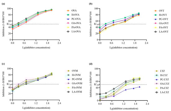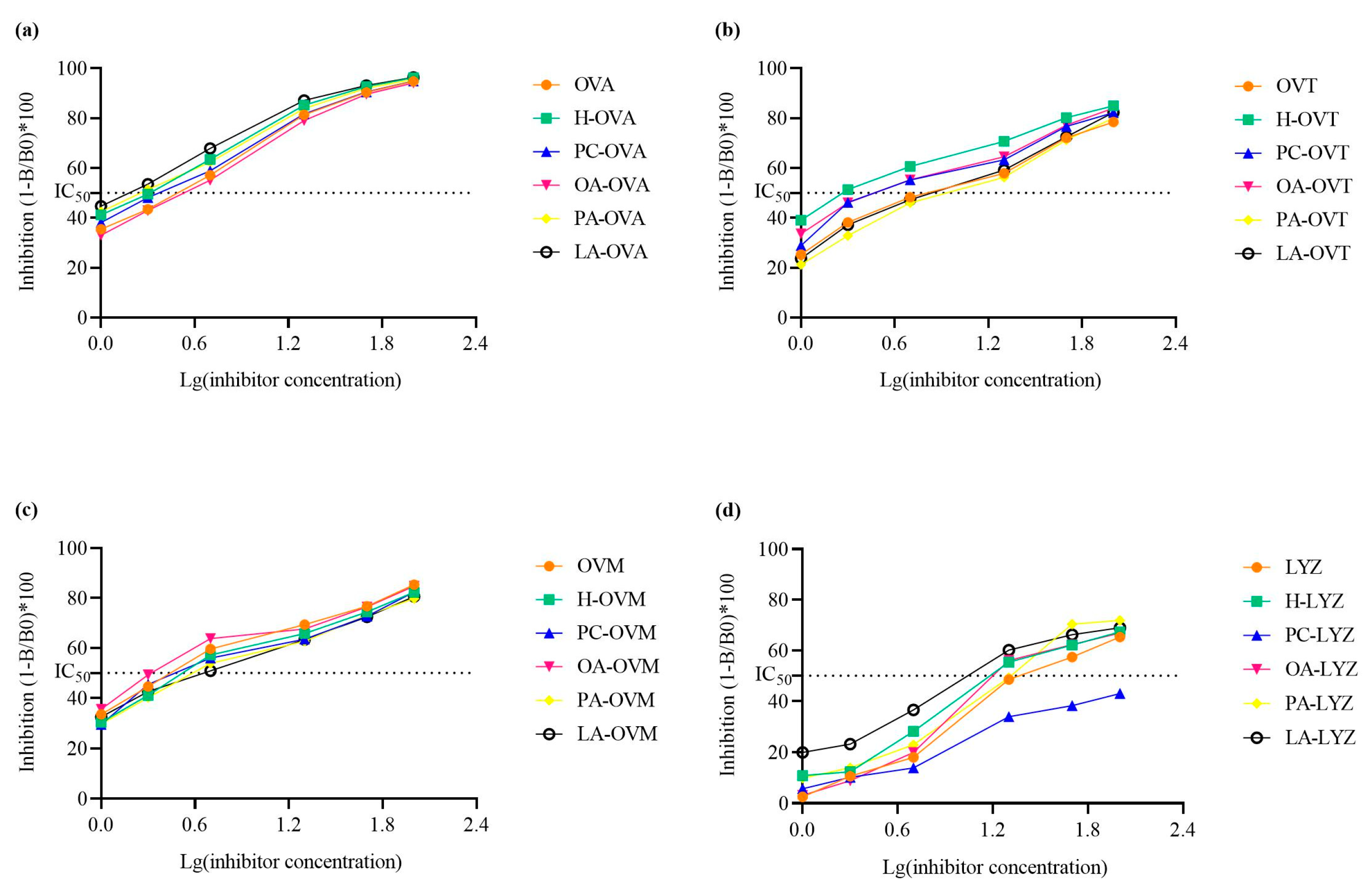 A competitive inhibition enzyme-linked immunosorbent assay demonstrated complex effects on protein antigenicity (Figure 7). OA treatment produced the highest IC50 value for OVA, indicating a reduction in antigenicity, while PA and LA enhanced it compared to the heat-treated controls (Figure 7a). For OVT, PA treatment showed the highest IC50 value, whereas OA had the most significant impact on OVM’s antigenicity (Figure 7b,c). Additionally, LA treatment resulted in the strongest antigenicity for LYZ, suggesting a strong lipid–protein interaction.