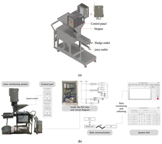 To design a monitoring system for juice extraction that measures the real-time input/output weight and controls the screw speed with wireless storage of data, two main components were employed: a load cell and a programmable logic controller (PLC) []. Two beam load cells, each with dimensions of 530 mm × 390 mm (width × length) and a maximum load capacity of 100 kg (SB-100K, A&D KOREA Ltd., Seoul, Republic of Korea) were used to measure the amount of input (raw material) and output (juice). These load cells were placed in front of the handle on the cart platform and below the juice outlet. The cart platform was designed to measure the real-time input into the existing juicer by comparing the weight of the entire system with the weight of the juicer. The cart platform had a width of 1400 mm, a length of 550 mm, and a maximum loading capacity of 500 kg (Figure 1a). The screw speed was controlled using a PLC (XBC-DR28U; LS ELECTRIC Co., Ltd., Anyang, Republic of Korea) installed on the back of the control panel. The input and output signals of the screw motor were transmitted via the PLC to a personal computer (PC) via a router (WL-WN572HG3, WAVLINK Technology Ltd., Shenzhen, China) (Figure 1b).