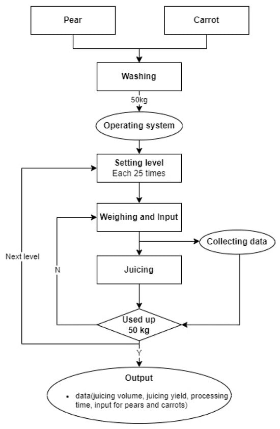 Pears and carrots were chosen as the juicing raw materials because of their popularity in juices and market affordability. To reflect the differences in the juice extraction due to hardness, we selected these two items, which are widely produced and easily available in Korea, and are also among the most popular choices in the juice extraction process. The selected pears were Pyrus pyrifolia, primarily cultivated in Asia, whereas the carrots were Daucus carota L, cultivated globally [,]. A total of 1250 kg of pears and carrots were used in this experiment. The pears were purchased from a farm in Cheonan, South Korea, and the carrots were purchased from the Noeun Agricultural and Fisheries Market in Daejeon, South Korea. Upon receipt, each raw material was cleaned and washed on the same day before the experiment. The raw materials were then divided into 25 groups of 50 kg each, following the experimental design.
