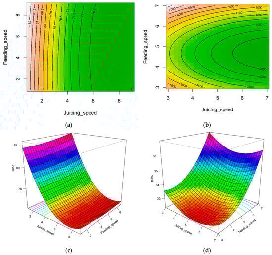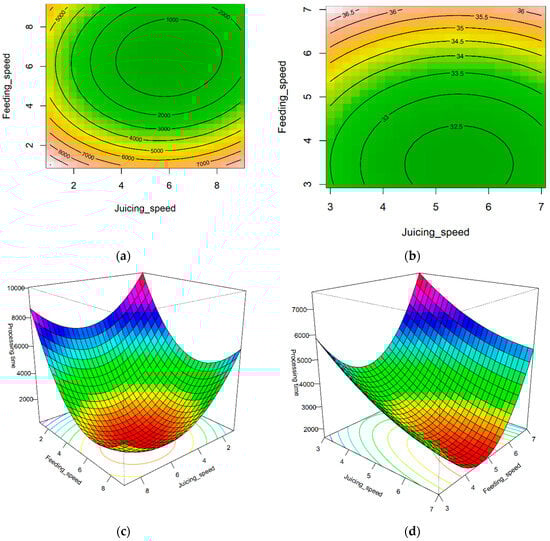 RSM was employed to optimize the juicing process for the yield and processing time as a function of the juicing and feeding speeds, controlled by screws in the extractor [,]. The preprocessing results for the pears and carrots were formulated using RSM with a second-order polynomial (Equation (2)):