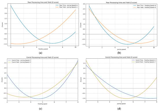 Variations in the yield and processing time standardized to the Z-score with fixed screw speeds at their optimum. (a) Yield and processing time of pear at the optimal juicing speed. (b) Yield and processing time of pear at the optimal feeding speed. (c) Yield and processing time of carrot at the optimal feeding speed. (d) Yield and processing time of carrot at the optimal juicing speed.