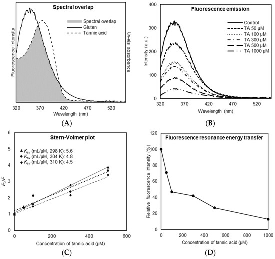 The fluorescence emission spectra of gluten protein and the UV–Vis absorbance spectra of TA were measured and showed integral overlapping area (Figure 1A). The overlapping area indicates that TA causes intrinsic tryptophan fluorescence quenching and binds to gluten protein [14,20]. Furthermore, others have shown that the quenching occurs via non-radiative energy transfer and that fluorescence resonance energy is transferred from the protein (i.e., gluten) as a donor to the ligand (i.e., TA) as an acceptor [21]. As shown in Figure 1B, fluorescence emission spectra of the gluten protein were gradually reduced by increasing the concentration of TA. There was a little shift in the fluorescence peak intensity from 348 to 350 nm with the addition of TA in the range of concentrations from 50 to 1000 µM. This implies that TA was closely located to the tryptophan residue for the quenching to occur, and there was a conformational change in gluten protein structure due to TA binding [22]. Figure 1C shows linear Stern–Volmer plots constructed by the fluorescence intensity of gluten protein quenched by TA at the different temperatures. An increase in temperature from 298 to 310 K resulted in a decrease in the Stern–Volmer quenching constant (Ksv), indicating an inverse correlation. It demonstrated that the fluorescence quenching process is initiated by the formation of a ground state complex between TA and gluten protein, which is referred to as a static quenching mechanism [23,24]. Figure 1D shows a decrease in fluorescence intensity of gluten protein quenched by TA at the different concentrations from 50 to 1000 µM. The addition of TA eventually led to a large reduction in fluorescence intensity, having 72.8% fluorescence energy transfer (FRET), in which energy transfer must be passed non-radiatively between the TA and gluten protein. It suggests that TA has a remarkable quenching capacity and considerable binding property toward gluten protein.