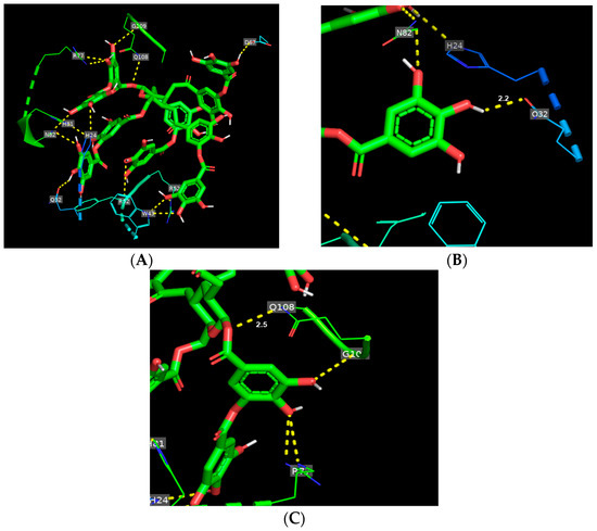 Binding mode of tannic acid (TA) toward gliadin. (A) Schematic representation of hydrogen bindings (yellow dashed line) between TA (green) and amino acid residues of gliadin. (B,C) Main hydrogen bonds between TA and glutamines (Q32 and Q108) of gliadin.
