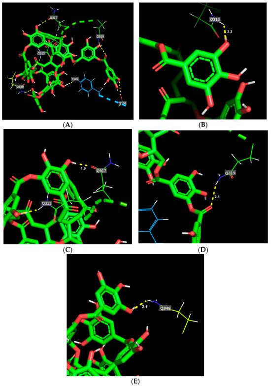 Binding mode of tannic acid (TA) toward glutenin. (A) Schematic representation of hydrogen bonds (yellow dashed line) between TA (green) and amino acid residues of glutenin. (B–E) main hydrogen bonds between TA and glutamines (Q313, Q317, Q319, and Q349) of glutenin.
