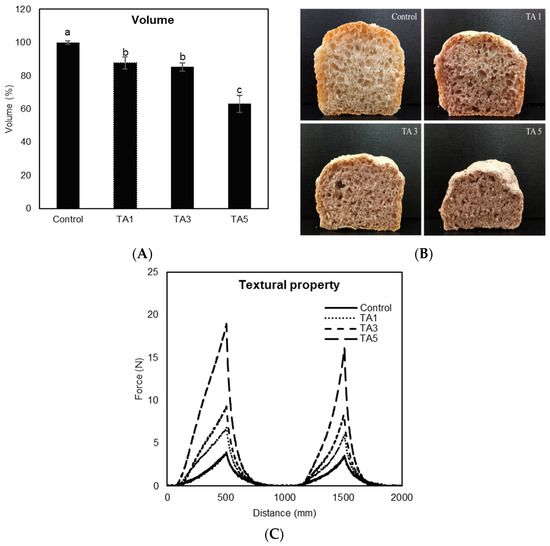Effect of tannic acid (TA) on baking performance. (A) Bread loaf volume. Different letters on bars indicate a significant difference at the 5% level. (B) Visual appearance of sliced bread loaf. (C) Textural property of bread.