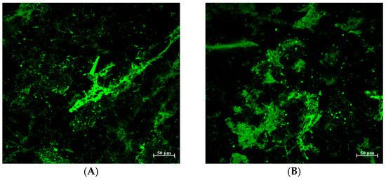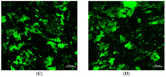 As mentioned, the addition of TA to the bread formulation produced a dense and compact bread structure represented by low loaf volume and a firmer texture compared to the control. To better understand the effect of TA on protein matrix structure, confocal laser scanning microscopy (CLSM) was used with fluorescamine for protein-specific dyeing (Figure 5, proteins appear as green) [34]. Additionally, breads treated with TA at different concentrations had differently appearing protein matrices compared to the control.