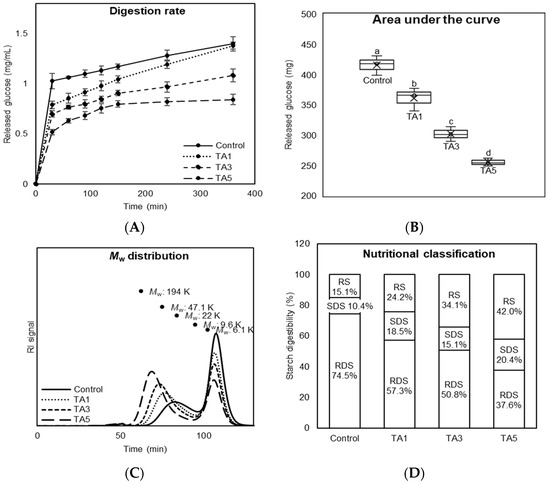 Digestion property of bread treated with tannic acid (TA). (A) Digestion rate of bread by starch digestive enzymes at 37 °C for 6 h. (B) Area under the curve (AUC) of total released glucose amount during a 6 h digestion process. Different letters on bars indicate a significant difference at the 5% level. (C) Molecular weight distribution of the remaining starch fractions from in vitro digestion of bread. (D) Nutritional classification of bread.