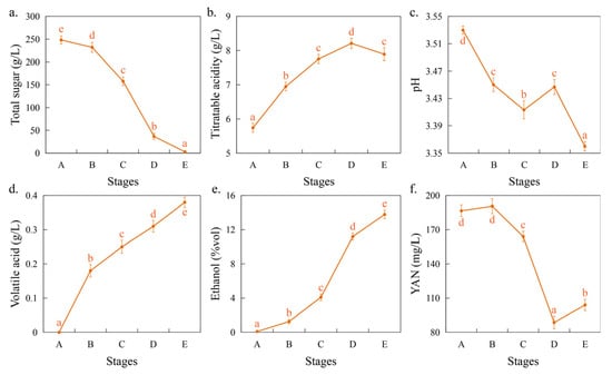 Changes in the physicochemical factors during spontaneous fermentation. Note: (a) total sugar; (b) titratable acidity; (c) pH; (d) volatile acid; (e) ethanol; (f) yeast assimilated nitrogen (YAN). Different letters indicate significant differences between different stages (p < 0.05), while the same letters indicate no significant differences.