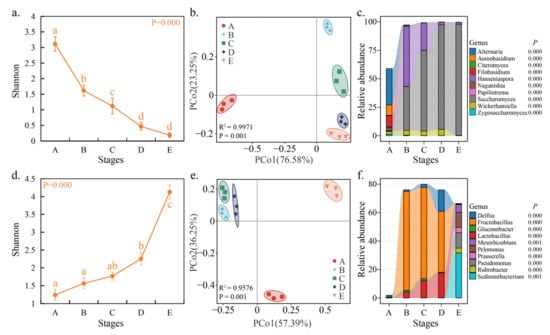 Microbial community diversity and composition during spontaneous fermentation. Note: α-diversity (Shannon index) of fungi (a) and bacteria (d) based on species level during fermentation; PCoA showed the distribution pattern of fungi (b) and bacteria (e) communities during fermentation; relative abundance changes in dominant fungi (c) and bacteria (f) taxa at the genus level (top 10).