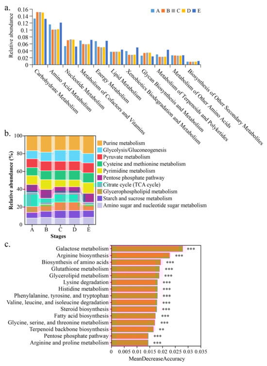 To gain a better understanding of the metabolic pathways associated with the identified genes, the genes were mapped to the KEGG pathway database. A total of 412 C-level metabolic pathways were identified in the annotated dataset. In the pathway related to metabolism at level B, the identified genes are mainly related to amino acid metabolism, carbohydrate metabolism, nucleotide metabolism, and metabolism of co-factors and co-factor vitamins, energy metabolism, lipid metabolism, xenobiotics biodegradation and metabolism, glycan biosynthesis and metabolism, metabolism of terpenoids and polyketides, metabolism of other amino acids, and the biosynthesis of other secondary metabolites (Figure 3a). Amino acids are not only essential nutrients for the growth and fermentation of S. cerevisiae, but they are precursors to many aromatic substances in wine []; carbohydrate metabolism involves yeast interacting with the sugars in grape juice, converting them into alcohol and carbon dioxide []; lipid metabolism plays a crucial role in maintaining the integrity and function of yeast membranes, which in turn influences the production of key aroma compounds, such as esters and higher alcohols []; in terpenoid metabolism, yeast can produce terpenoid compounds with aroma activity, by metabolizing the terpenoid precursor substances in grapes []; other metabolic pathways mainly affect the growth and reproduction of yeast, but by regulating these metabolic pathways, the quality of wine can be improved. Among the metabolism-related pathways, purine metabolism, glycolysis/gluconeogenesis, pyruvate metabolism, cysteine and methionine metabolism, pyrimidine metabolism, the pentose phosphate pathway, the citrate cycle, glycerophospholipid metabolism, starch and sucrose metabolism, amino sugar and nucleotide sugar metabolism at level C were particularly abundant during fermentation (Figure 3b). The random forest method was used to rank the importance of the metabolism-related pathways. The MeanDecreaseAccuracy index showed that galactose metabolism, arginine biosynthesis, the biosynthesis of amino acids, glutathione metabolism, glycerolipid metabolism, lysine degradation, histidine metabolism, phenylalanine tyrosine and tryptophan biosynthesis, valine leucine and isoleucine degradation, steroid biosynthesis, fatty acid biosynthesis, glycine serine and threonine metabolism, terpenoid backbone biosynthesis, the pentose phosphate pathway, and arginine and proline metabolism at level C were the 15 most important metabolic pathways during fermentation (Figure 3c).
