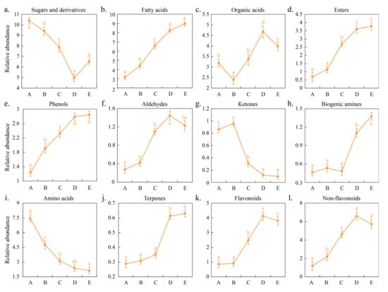 UHPLC–MS/MS was used to evaluate the metabolic profiles at different stages of spontaneous fermentation of wine to better understand the changes in flavor compounds. Molecules in wine include a large number of primary and secondary metabolites. In this study, important metabolites during fermentation were evaluated, among which 19 sugars and derivatives, 20 fatty acids, 10 organic acids, 5 esters, 4 phenols, 3 aldehydes, 1 ketone, 5 biogenic amines, 17 amino acids, 1 terpene, 12 flavonoids, and 17 non-flavonoids were identified (Supplementary Table S1). Figure 4 shows the variation trend in the total content of these flavor families during fermentation. The total content of sugars and derivatives decreased from 9.93% (A) to 5.05% (C) and then increased to 7.58% (E) during fermentation (Figure 4a). Glucose and fructose, as the primary sugar components, are consumed by yeast during alcoholic fermentation to produce ethanol and carbon dioxide; in the later stages of fermentation, polysaccharides with lower molecular weights in grape skins, such as arabinogalactan proteins and rhamnogalacturonan II, are gradually released and increase with the extension of the maceration time; furthermore, due to yeast autolysis and the action of β-glucanases, mannoproteins and glucans are also released in large quantities []. These sugars enhance the sweetness of wine and contribute to the fullness of wine []. The total content of fatty acids, esters, phenols, and aldehydes gradually increased during fermentation and were 8.98%, 3.78%, 2.84%, and 1.23% at the end of fermentation (E), respectively (Figure 4b,d–f). Studies have shown that the concentration of fatty acids, esters, and aldehyde compounds gradually increased as the fermentation process progressed [], which was mainly affected by S. cerevisiae, non-Saccharomyces yeasts, and lactic acid bacteria []. The low concentration of volatile fatty acids can give the wine a fruity, cheesy, and fatty taste; ester compounds can give wine a pleasant smell, such as a fruity and floral smell; aldehydes provide the characteristic aromas of wine, such as green, nut, and toast aromas []. These compounds can enhance the complexity of the aroma of wine. The total organic acid content decreased from 3.18% (A) to 2.39% (B), then increased to 4.68% (D), and finally decreased to 3.98% (E) (Figure 4c). During wine fermentation, the content of tartaric acid, malic acid, ascorbic acid, and citric acid typically decrease; oxalic acid and succinic acid increase first and then decrease; and lactic acid and acetic acid increase at the end of fermentation [,]. The variety and concentration of organic acids dictate the acidity and pH levels of wine. These acids exhibit antimicrobial effects, and a lower pH is conducive to maintaining the wine’s freshness []. The total ketone content increased from 0.86% (A) to 0.96% (B) and then gradually decreased to 0.09% (E) (Figure 4g). Tang et al. (2021) investigated the changes in metabolites during the fermentation of Vidal ice wine and the results showed that the total content of ketones gradually decreased as the fermentation progressed []. Ketones can give wine a pleasant aroma, such as fruity and floral aromas; for example, 6-methyl-5-hepten-2-one enhances the citrus aroma of wine []. The total content of biogenic amines remained relatively unchanged during the early stages of fermentation (A to C), but gradually increased to 1.38% (E) during the later stages (Figure 4h); the total content of amino acids gradually decreased to 2.12% (E) during fermentation (Figure 4i). During wine fermentation, amino acid decarboxylase can catalyze the corresponding free amino acids to decarboxylate and form the corresponding biological amine compounds []. However, conflicting conclusions have been drawn regarding the influence of the amino acid concentration on BA formation [,,]. Amino acids serve as precursors for numerous aromatic compounds in wine. Specific amino acids, such as tryptophan, tyrosine, and phenylalanine, can be converted into volatile phenols, ethers, and esters through the shikimate pathway, which significantly impacts the flavor profile of wine []. The total content of terpenes gradually increased to 0.64% (E) during fermentation (Figure 4j). Skin maceration of grapes can increase the content of free and some bound terpenes in wine []; in addition, the production of terpene compounds depends on some non-Saccharomyces yeasts, which can secrete β-glucosidase and hydrolyze the glycoside bond to produce terpenes, such as linalsol and geranyl []. Specific terpenes, such as monoterpenes and sesquiterpenes, contribute to the fruity and floral aroma characteristics of young wines []. The total content of flavonoids and non-flavonoids gradually increased to 4.13% and 6.61% (D) during fermentation, respectively, but decreased slightly at the end of fermentation (E) to 3.49% and 5.73%, respectively (Figure 4k,l). Qin et al. (2023) found that maceration could also promote the extraction of flavonoids from Black Mulberry peel into juice and that the concentration increased with the extension of the maceration time; furthermore, the concentration of various flavonoid compounds exhibit distinct changes during fermentation; the majority, such as myricetin, epicatechin, and rutin, show an increase, whereas a minority, including kaempferol, luteolin-7-O-glucoside, quercetin, and epicatechin, demonstrate a decrease. During the later stages of fermentation, phenolic compounds undergo oxidation reactions or interact with proteins to form complexes that precipitate, both of which contribute to a reduction in the total content of flavonoids [,]. Similarly, maceration promoted the release of non-flavonoids from grape skins into the juice/wine during fermentation [], but later in fermentation, protein interactions with non-flavonoids (e.g., pectin, phenolic acids, tannins) formed a complex precipitate, which also resulted in a decrease in the conten