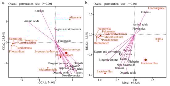 RDA analysis of dominant fungal (a) and bacterial (b) taxa abundance and flavor metabolite concentration during wine fermentation.