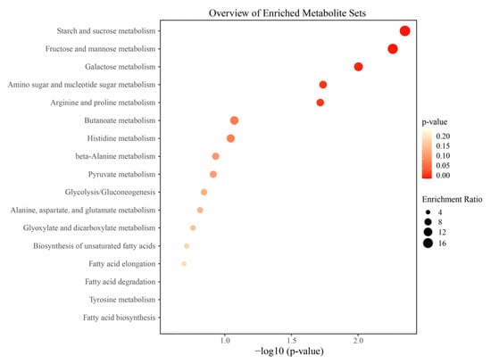 The enrichment analysis of metabolic pathways can elucidate the metabolic mechanism in spontaneous fermentation. In this study, differential metabolites were used for metabolic pathway enrichment analysis based on the KEGG database (Figure 6). The results showed that a total of 17 metabolic pathways were identified, including starch and sucrose metabolism (ko00500); fructose and mannose metabolism (ko00051); galactose metabolism (ko00052); amino sugar and nucleotide sugar metabolism (ko00520); arginine and proline metabolism (ko00330); butanoate metabolism (ko00650); histidine metabolism (ko00340); β-alanine metabolism (ko00410); pyruvate metabolism (ko00620); glycolysis/gluconeogenesis (ko00010); alanine, aspartate, and glutamate metabolism (ko00250); glyoxylate and dicarboxylate metabolism (ko00630); biosynthesis of unsaturated fatty acids (ko01040); fatty acid elongation (ko00062); fatty acid degradation (ko00071); tyrosine metabolism (ko00350); and fatty acid biosynthesis (ko00061). The above metabolic pathways are involved in the synthesis, decomposition, transformation, and utilization of sugars, amino acids, and fatty acids. These metabolic pathways are of particular interest in this study, as they are potentially involved in the production of flavor compounds within Cabernet Sauvignon wines.