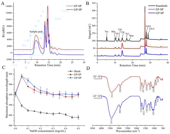 (A) HPGPC chromatograms of SPs; (B) HPAEC chromatograms of SPs; (C) maximum absorption wavelength (λmax) of Congo red–polysaccharide complexes at varying NaOH concentrations for SPS; (D) FT-IR spectra of SPs.